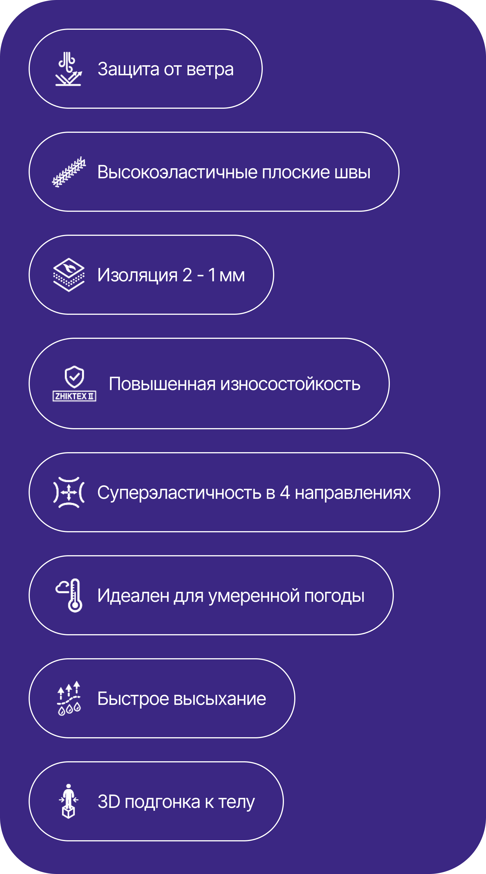 Технология усиления 3D-вязания ZhikTexTM II используется в области сиденья и голеней, для обеспечения дополнительной защиты и долговечности. Усиленные швы в области лодыжек позволяют добиться индивидуальной посадки, позволяющей подобрать длину штанины специально для вас.