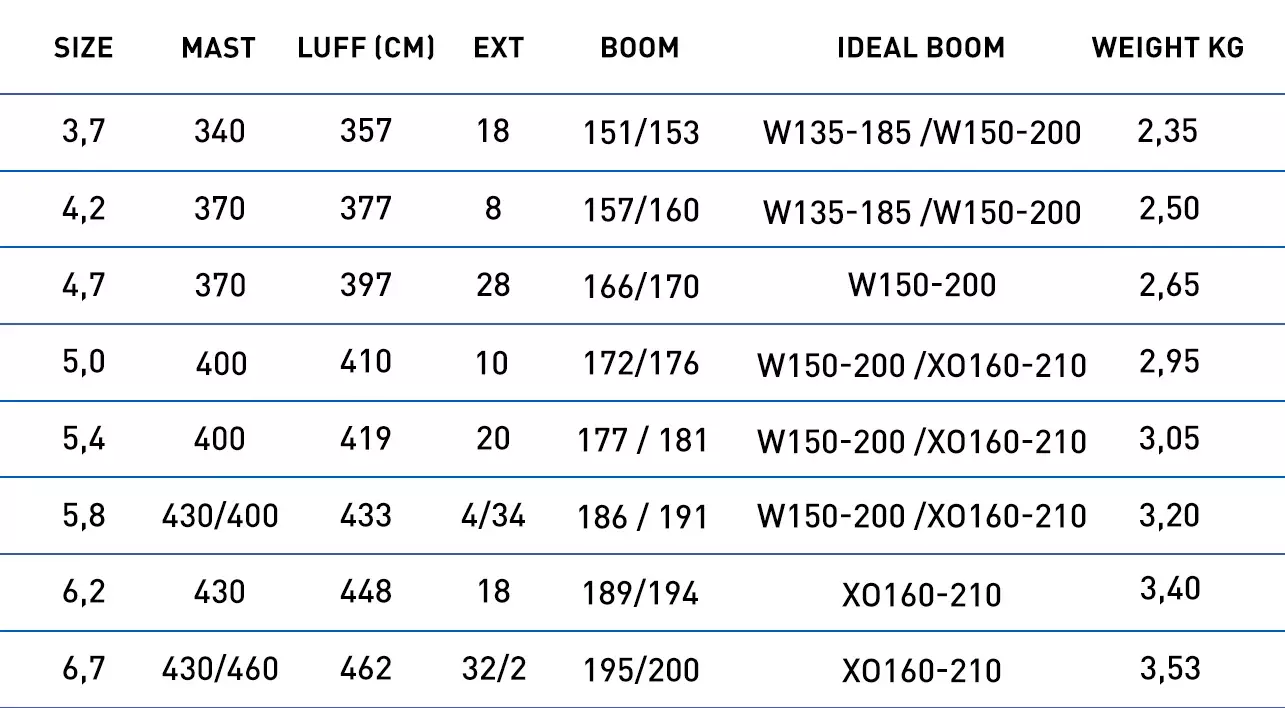 Размеры от 3,7 до 5,8 — это мощные волновые паруса с невероятно малым инерционным весом, идеально подходящие для прыжков и атаки волн благодаря своей легкости, стабильной мощности и скорости. Размеры 6,2 и 6,7 — это паруса для свободного хода, идеально подходящие для фрирайда на спокойной воде, обеспечивающие стабильность, максимальную скорость, широкий диапазон ветра и легкое движение против ветра. Версия Gen#2 — это совершенно новый парус с улучшенными профилями, скручиванием и геометрией, а также дополнительными волоконными усилениями в критических зонах. Результатом является повышенная стабильность, движение вперед, высокий контроль ветра и превосходные характеристики.