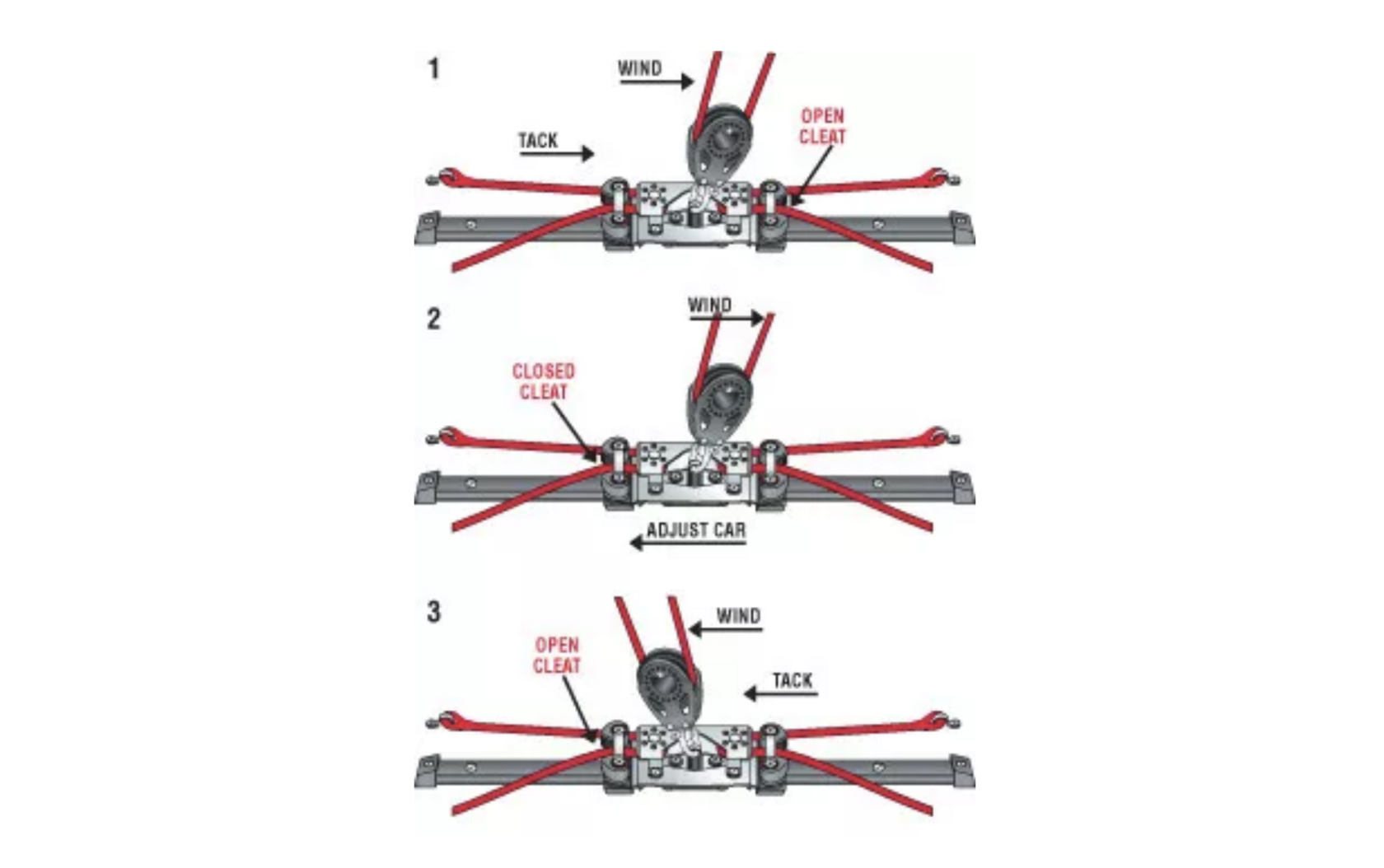 При сильном ветре обычно желательно, чтобы каретка находилась ниже центральной линии. Как и с любой другой кареткой шкота грота, плавно отведите управляющий трос в нужное положение. На противоположном галсе каретка шкота наветренного направления автоматически зеркально отображает заданное положение.